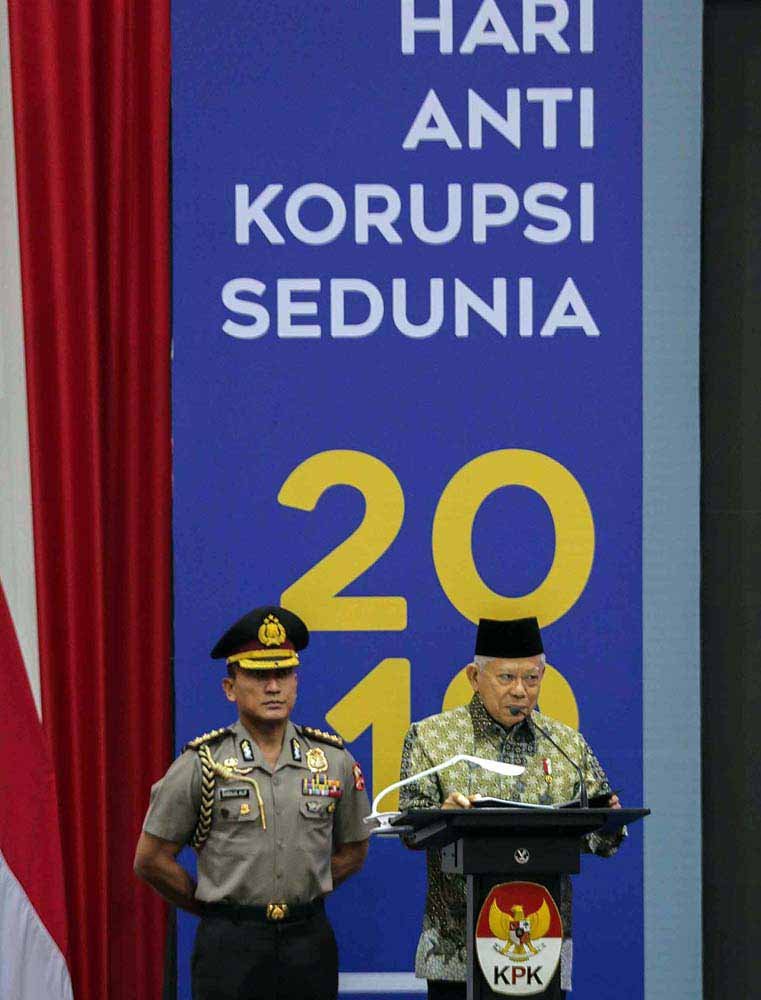 Wapres KH Ma’ruf Amin memberikan sambutan saat membuka peringatan Hari Antikorupsi Sedunia di Gedung Komisi Pemberantasan Korupsi (KPK) di Kuningan, Jakarta Selatan, Senin (9/12/2019). KPK menggelar peringatan Hari Antikorupsi Sedunia 2019 dengan tema “Bersama Melawan Korupsi Mewujudkan Indonesia Maju”.(Bisnis Jakarta/ADE)