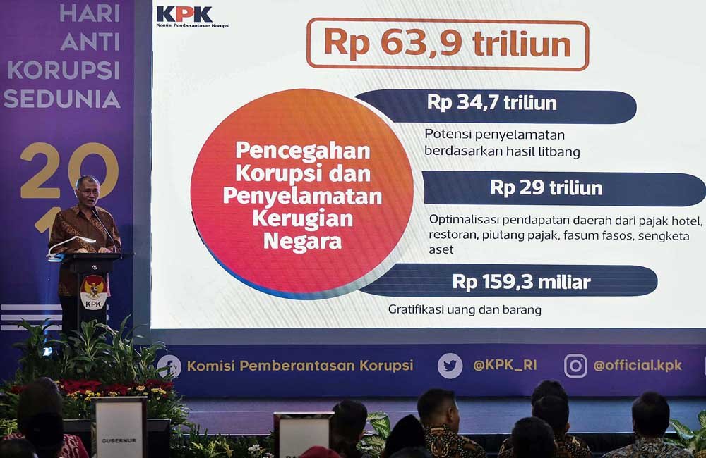 Ketua KPK Agus Rahardjo menyampaikan sambutan saat peringatan Hari Antikorupsi Sedunia di Gedung Komisi Pemberantasan Korupsi (KPK) di Kuningan, Jakarta Selatan, Senin (9/12/2019). KPK menggelar peringatan Hari Antikorupsi Sedunia 2019 dengan tema “Bersama Melawan Korupsi Mewujudkan Indonesia Maju”.(Bisnis Jakarta/ADE)