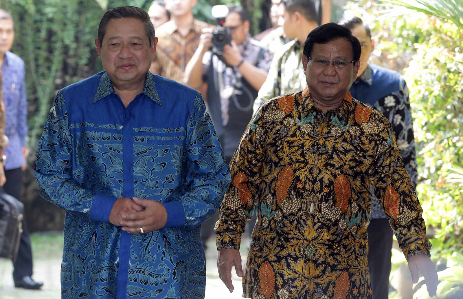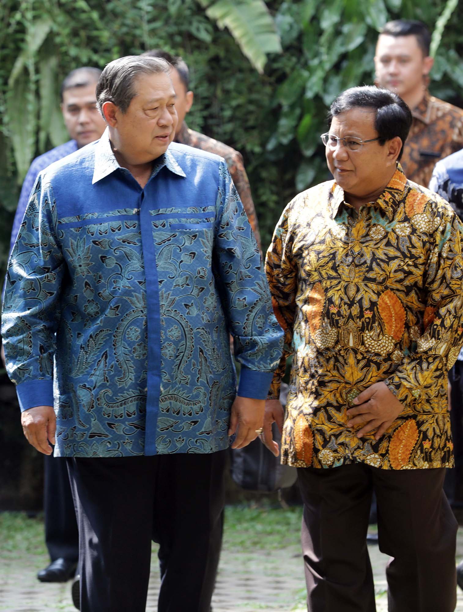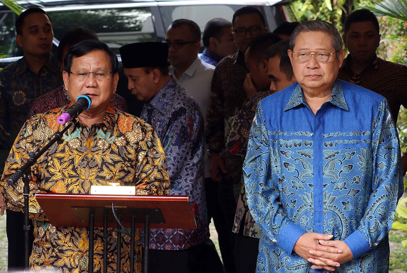 Ketua Umum Partai Gerindra Prabowo Subianto bertemu dengan Ketua Umum Partai Demokrat Susilo Bambang Yudhoyon di kediaman Prabowo, Jalan Kertanegara, Jakarta Selatan, Senin (30/7/18). Pertemuan tersebut merupakan tindak lanjut dari komunikasi politik yang dibangun kedua partai untuk Pilpres 2019.(Bisnis Jakarta/ADE)