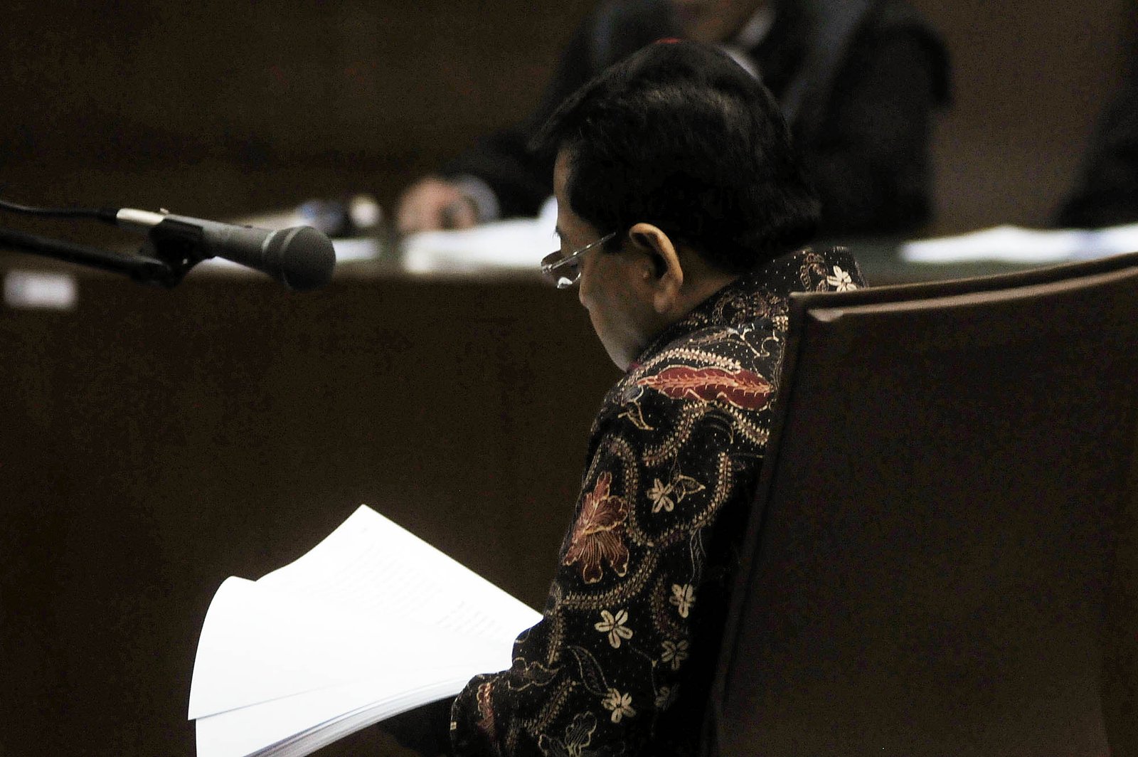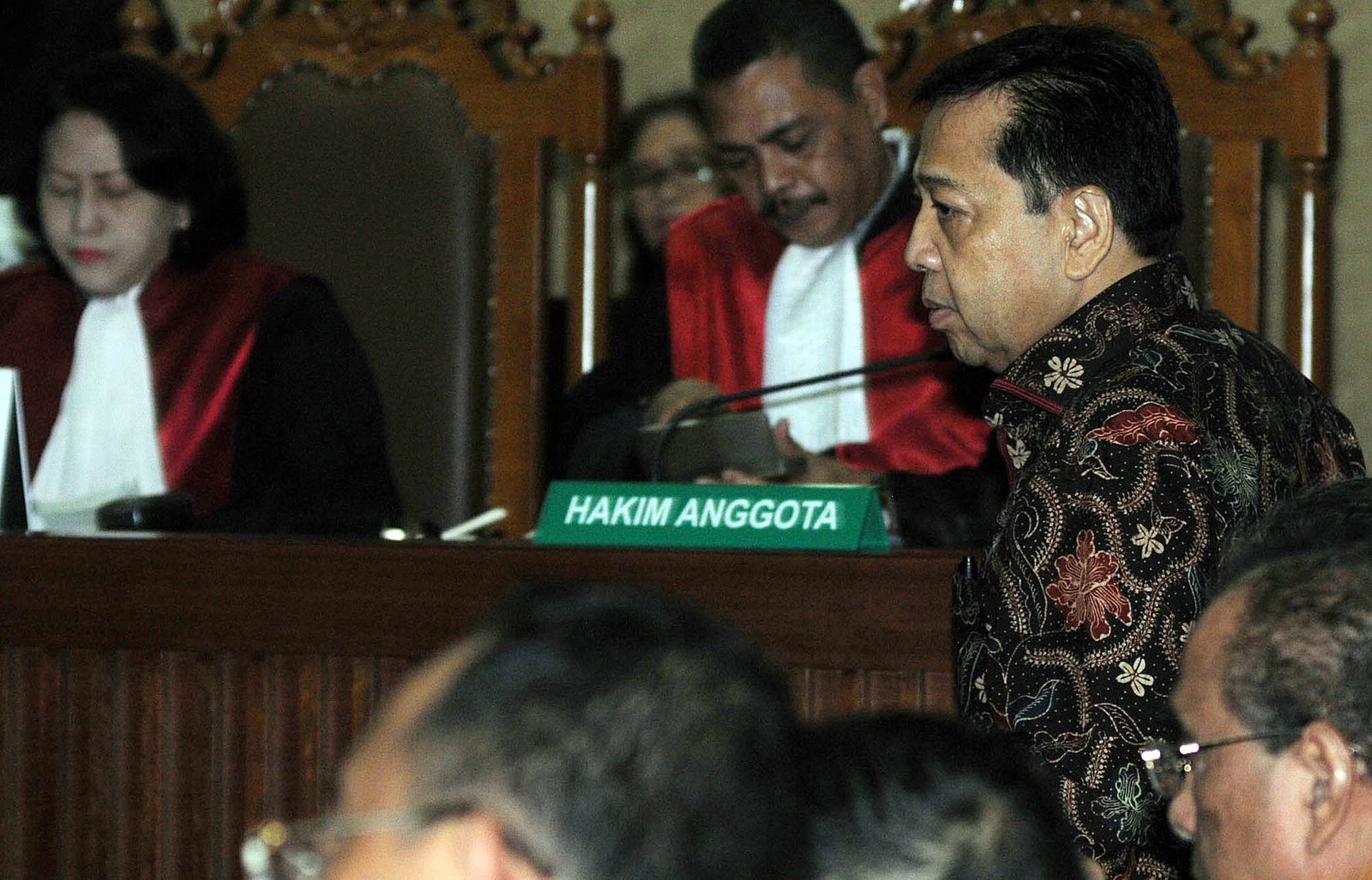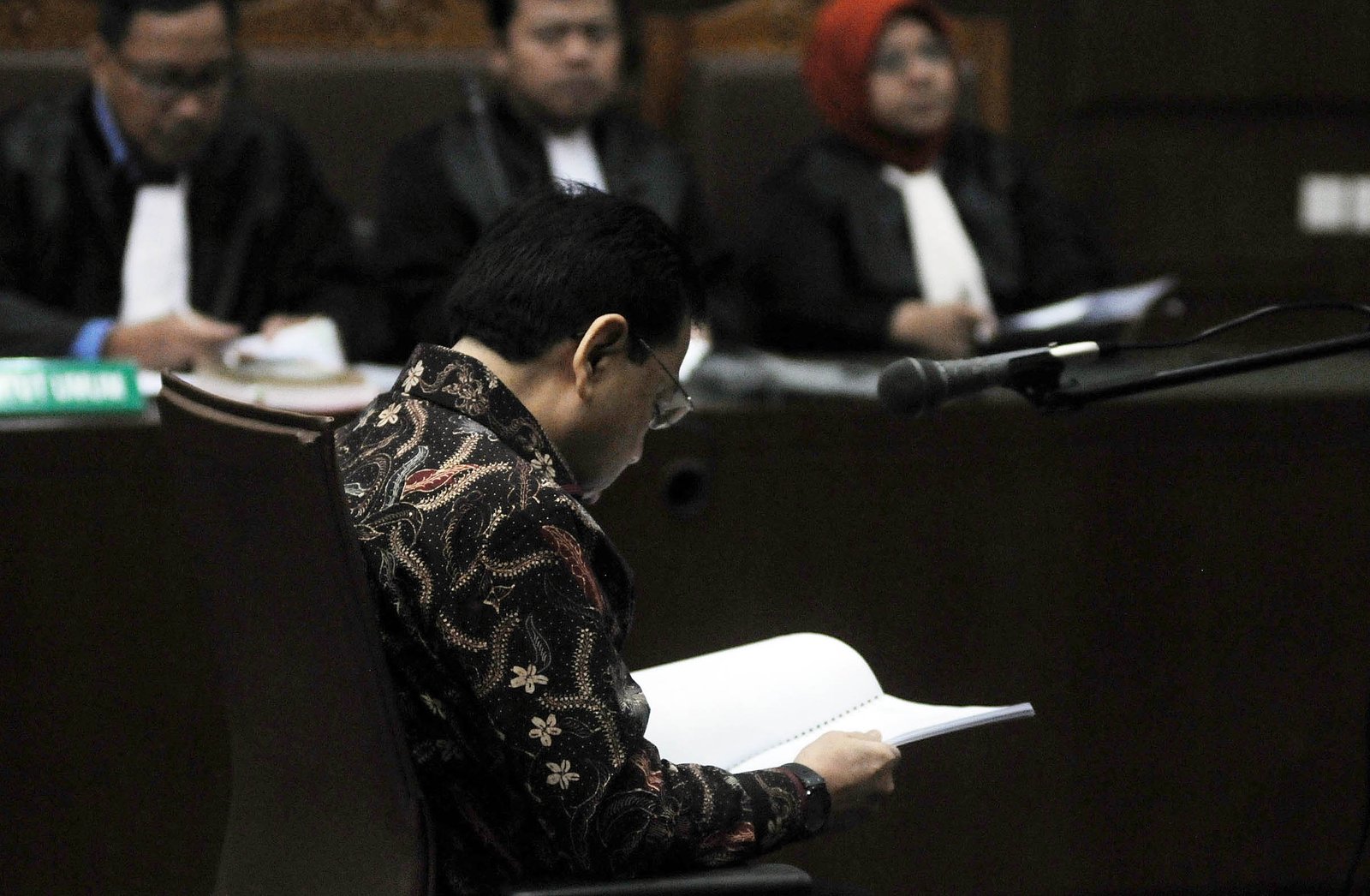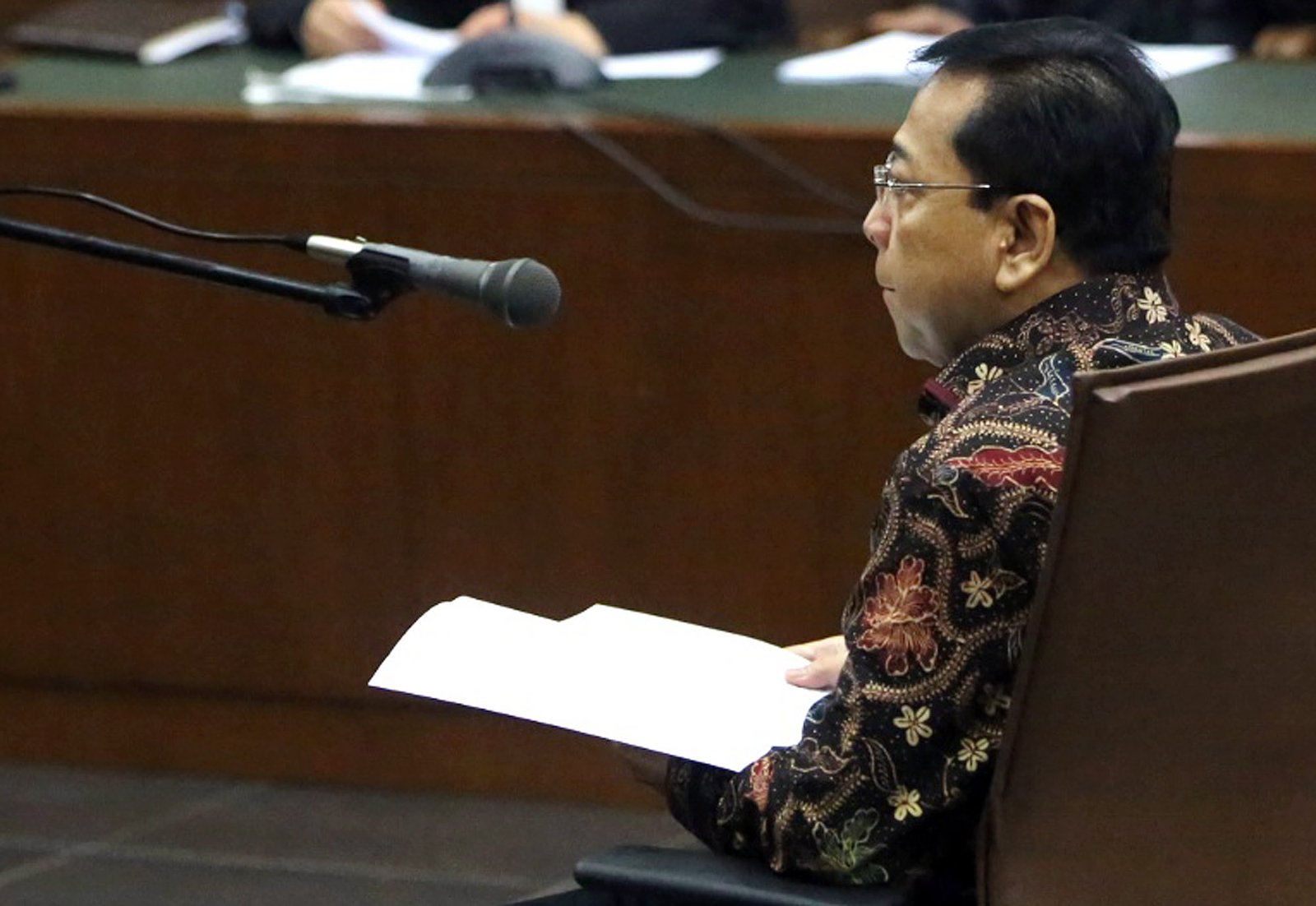 Terdakwa kasus dugaan korupsi kartu tanda penduduk berbasis elektronik atau e-KTP Setya Novanto saat menjalani sidang pembacaan eksepsi atau pembelaan di Pengadilan Tipikor, Kemayoran, Jakarta Pusat, Rabu (20/12). Jaksa Komisi Pemberantasan Korupsi (KPK) mendakwa Setya Novanto melakukan intervensi pada lelang proyek e-KTP senilai Rp 5,9 triliun. Setya Novanto juga didakwa menerima uang senilai US$ 7,3 juta dari proyek itu dan terlibat dalam sejumlah pertemuan.(Bisnis Jakarta/ADE)