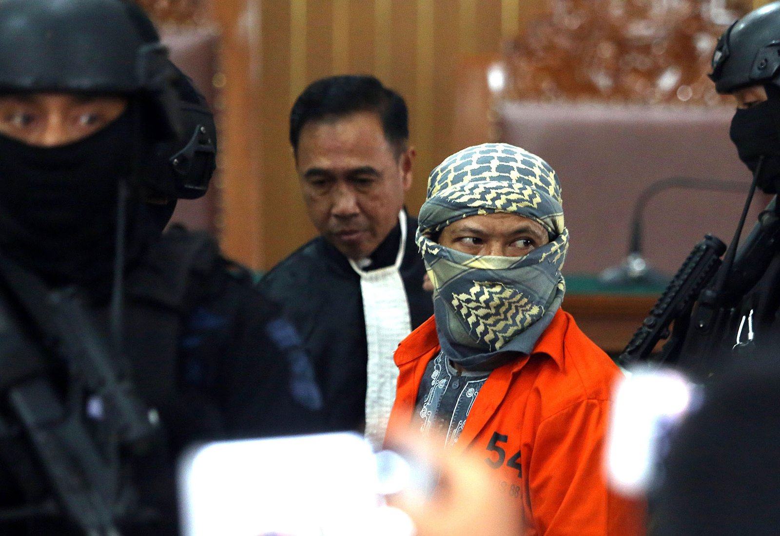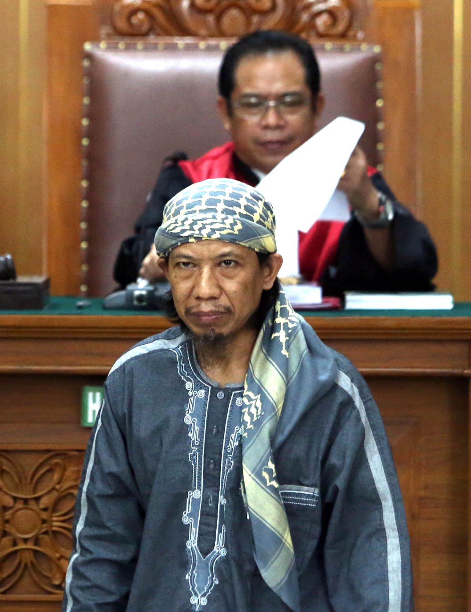 Terdakwa kasus dugaan serangan teror bom Thamrin Oman Rochman alias Aman Abdurrahman saat menjalani sidang nota pembelaannya atau pledoi dengan pengawalan ketat petugas Kepolisian di Pengadilan Negeri Jakarta Selatan, Jumat (25/5/18). Dalam pledoinya Aman Abdurrahman menyatakan siap jika Majelis Hakim Pengadilan Negeri Jakarta Selatan menjatuhkan vonis mati terhadap dirinya sesuai tuntutan Jaksa.(Bisnis Jakarta/ADE)