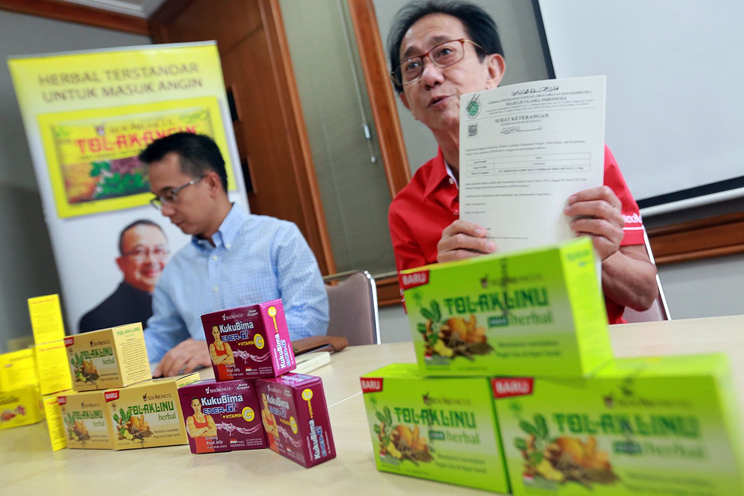 Direktur Sido Muncul Irwan Hidayat saat menunjukkan Sertifikat Halal dari Lembaga Pengkajian Pangan, Obat-obatan, dan Kosmetika Majelis Ulama Indonesia (MUI) untuk produk-produk Sido Muncul di kantor Sido Muncul, Jakarta Selatan. PT Industri Jamu dan Farmasi Sido Muncul,Tbk mendapatkan Sertifikat Halal dari Lembaga Pengkajian Pangan, Obat-obatan, dan Kosmetika MUI untuk 241 produk Sido Muncul.