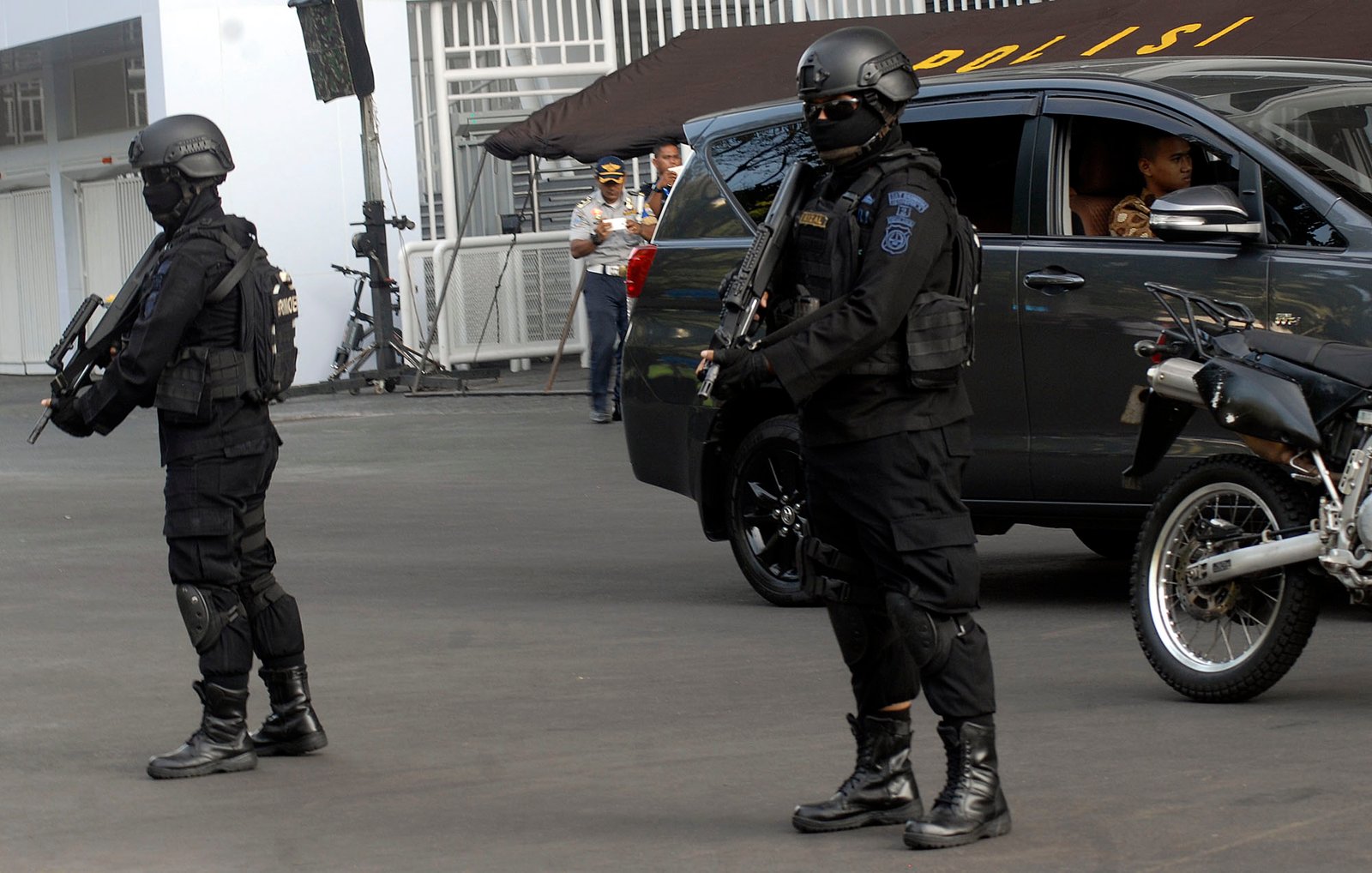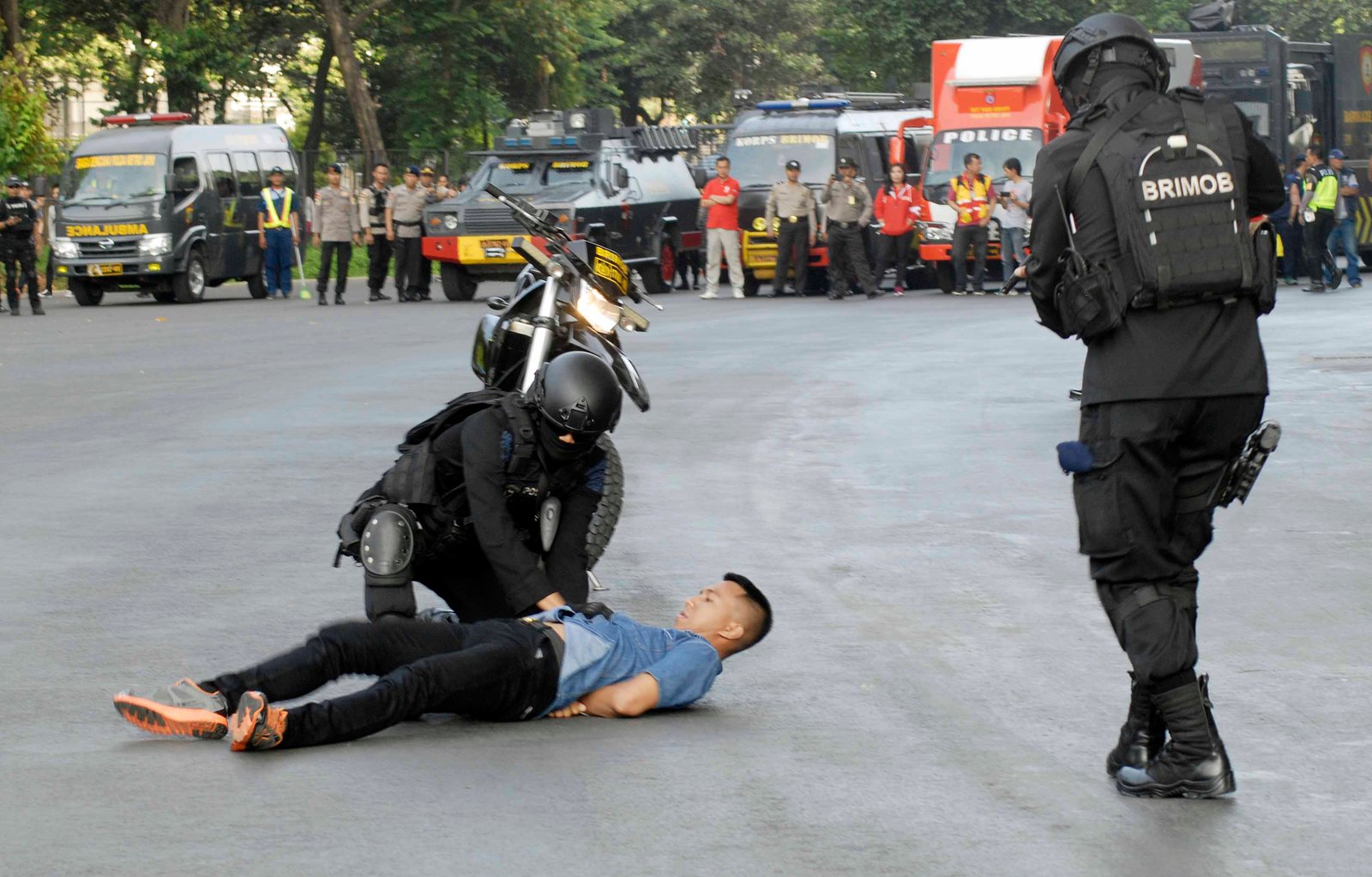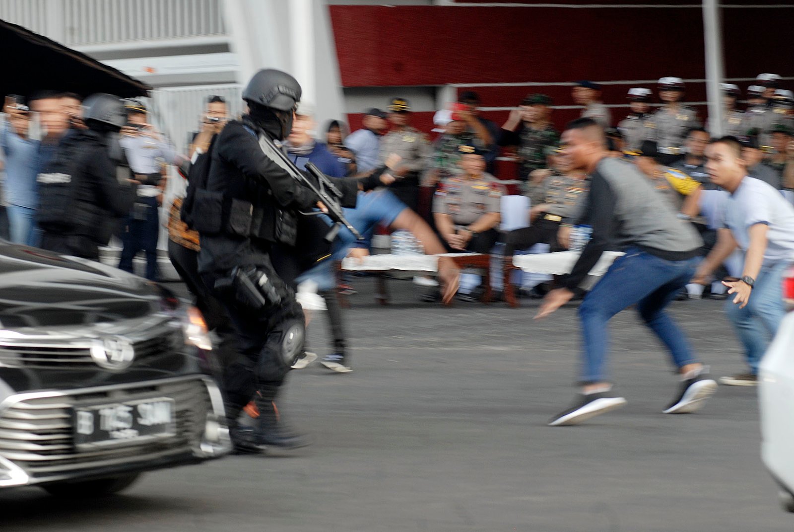 Polda Metro Jaya menggelar apel dan simulasi pengamanan persiapan test event Asian Para Games, di Stadion Utama Gelora Bung Karno, Jakarta Pusat, Sabtu (23/6/18). Apel diikuti 2.500 personel gabungan TNI/Polri yang akan mengamankan test event Asian Para Games 26 Juni-3 Juli 2018.(Bisnis Jakarta/ADE)