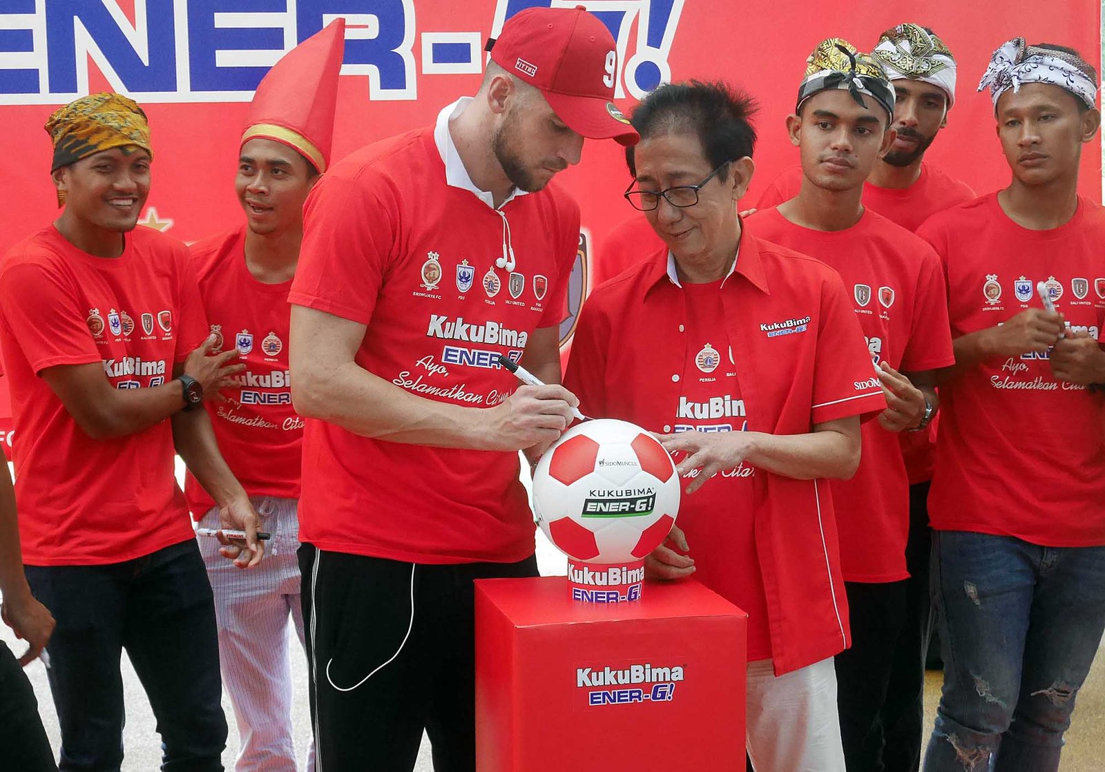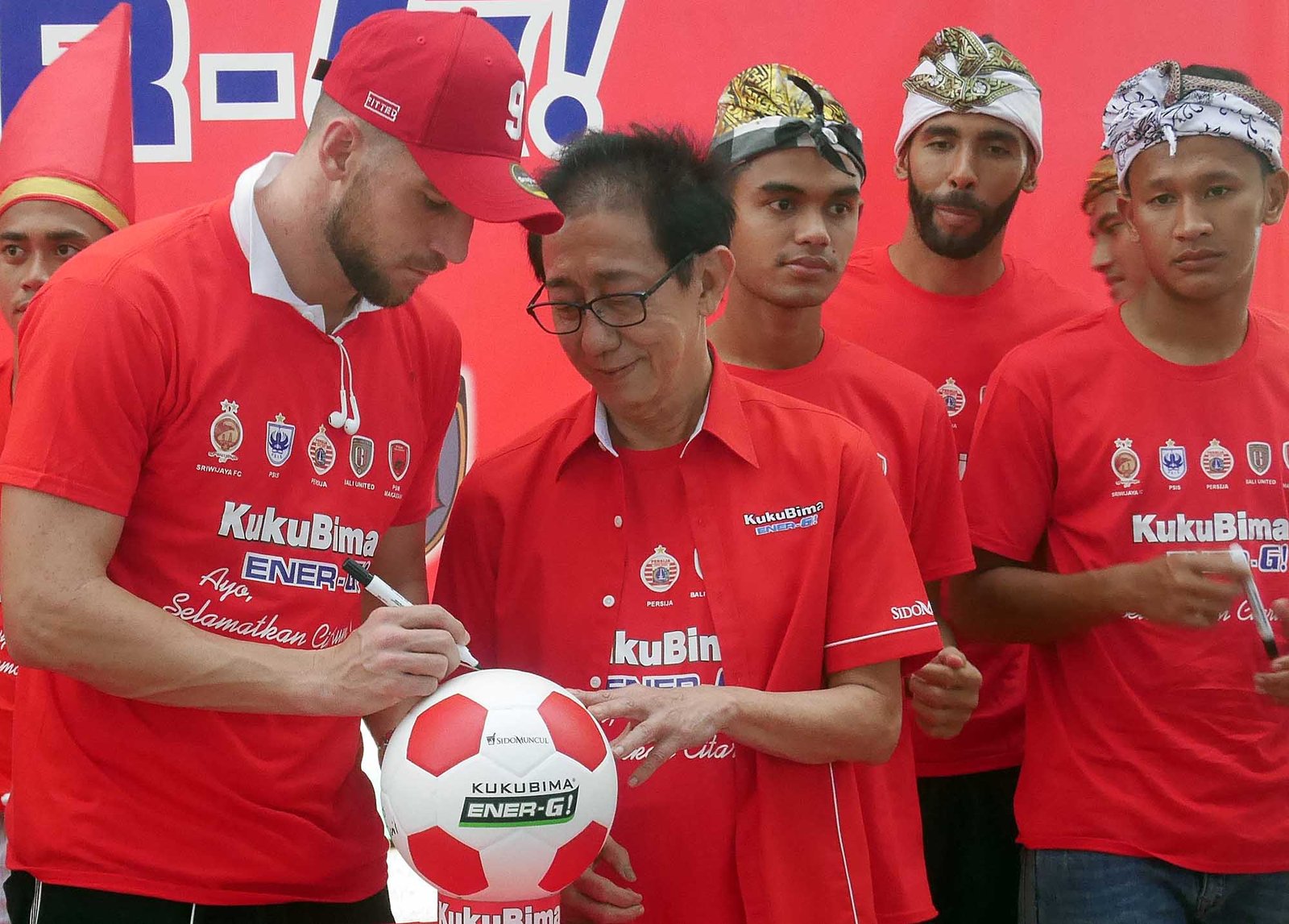 Penyerang Persija Jakarta Marko Simic (kiri) menandatangani bola disaksikan DIrektur PT Sido Muncul Irwan Hidayat (kanan) pada temu sponsor Kuku Bima Energi Sido Muncul dengan lima klub sepak bola di Jakarta, Senin (19/2). Selain memberi dukungan kepada Persija Jakarta, Sriwijaya, PSIS, PSM, dan Bali United, Sido Muncul juga akan membuat iklan “Ayo Selamatkan Citarum” guna menyadarkan dan mengedukasi mastyarakat mengenai lingkungan khususnya Sungai Citarum yang memiliki aliran mencapai 300 KM.(Bisnis Jakarta/ADE)