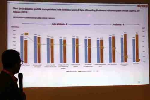 Peneliti Alvara Research Center Hasanuddin Ali saat memaparkan hasil survei nasional di seluruh Indonesia, di Jalan KH.Wahid Hasyim, Jakarta Pusat, Jumat (12/4/2019). Pada survey April 2019 yang menggunakan multi-stage random sampling dengan melakukan wawancara terhadap 2.000 responden yang berusia 17 tahun ke atas dan memiliki hak pilih pada pertanyaan jika Pilpres diadakan hari ini didapatkan hasil elektabilitas pasangan capres cawapres Joko Widodo-KH Ma'ruf Amin sebesar 52,2 %, sementara pasangan capres cawapres Prabowo-Sandi sebesar 38,8 %, dimana yang belum memutuskan (undecided voters) sebesar 9,0 %.(Bisnis Jakarta/ADE)