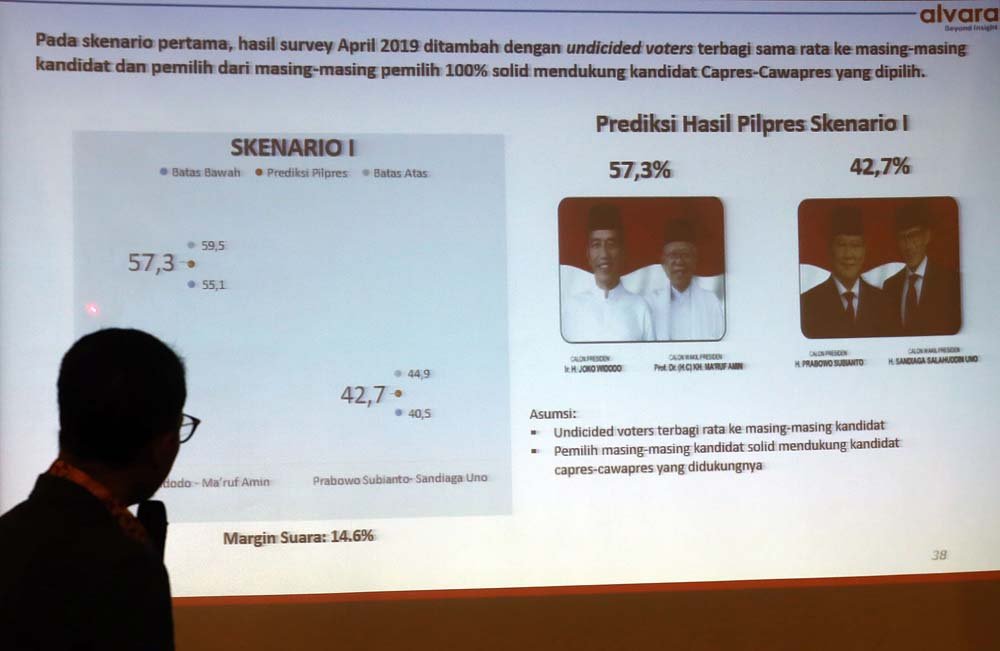 Peneliti Alvara Research Center Hasanuddin Ali saat memaparkan hasil survei nasional di seluruh Indonesia, di Jalan KH.Wahid Hasyim, Jakarta Pusat, Jumat (12/4/2019). Pada survey April 2019 yang menggunakan multi-stage random sampling dengan melakukan wawancara terhadap 2.000 responden yang berusia 17 tahun ke atas dan memiliki hak pilih pada pertanyaan jika Pilpres diadakan hari ini didapatkan hasil elektabilitas pasangan capres cawapres Joko Widodo-KH Ma’ruf Amin sebesar 52,2 %, sementara pasangan capres cawapres Prabowo-Sandi sebesar 38,8 %, dimana yang belum memutuskan (undecided voters) sebesar 9,0 %.(Bisnis Jakarta/ADE)