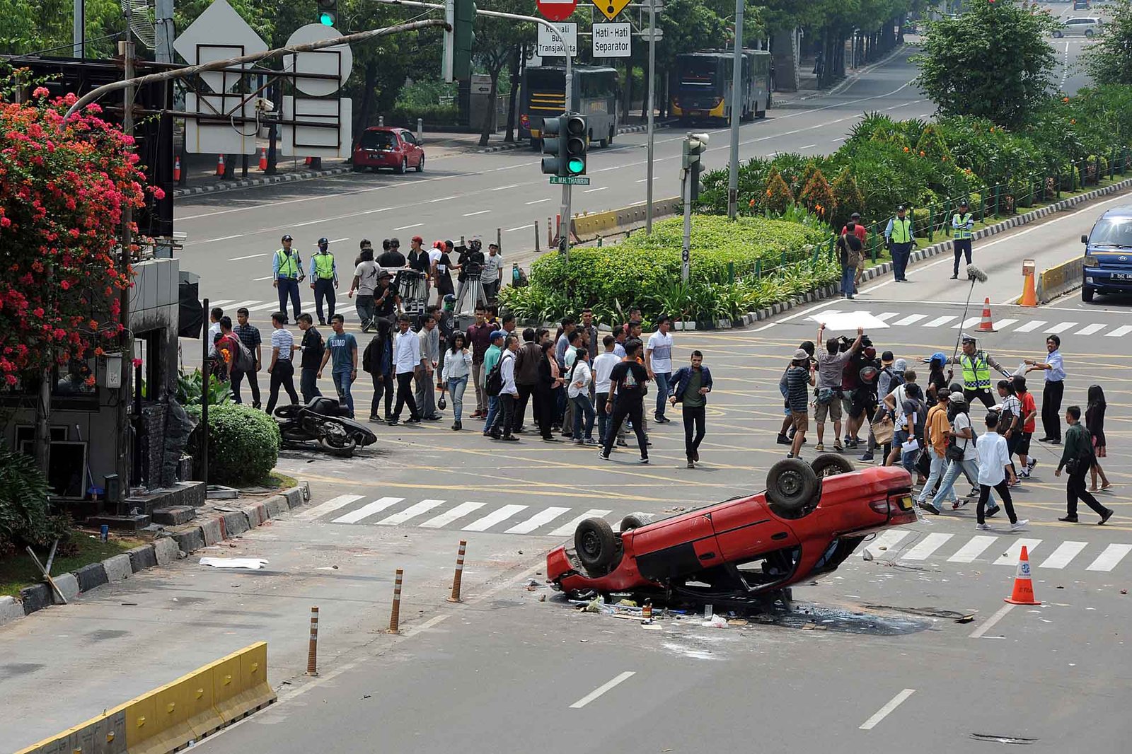 Suasana Jalan MH Thamrin, Jakarta Pusat, Sabtu (14/4/18) saat syuting film terjadinya peristiwa Bom Thamrin. Film yang berjudul “22 Menit” tersebut dibuat atas cerita fiksi yang berdasarkan kisah nyata saat terjadinya bom bunuh diri yang dikenal sebagai Bom Thamrin.(Bisnis Jakarta/ADE)