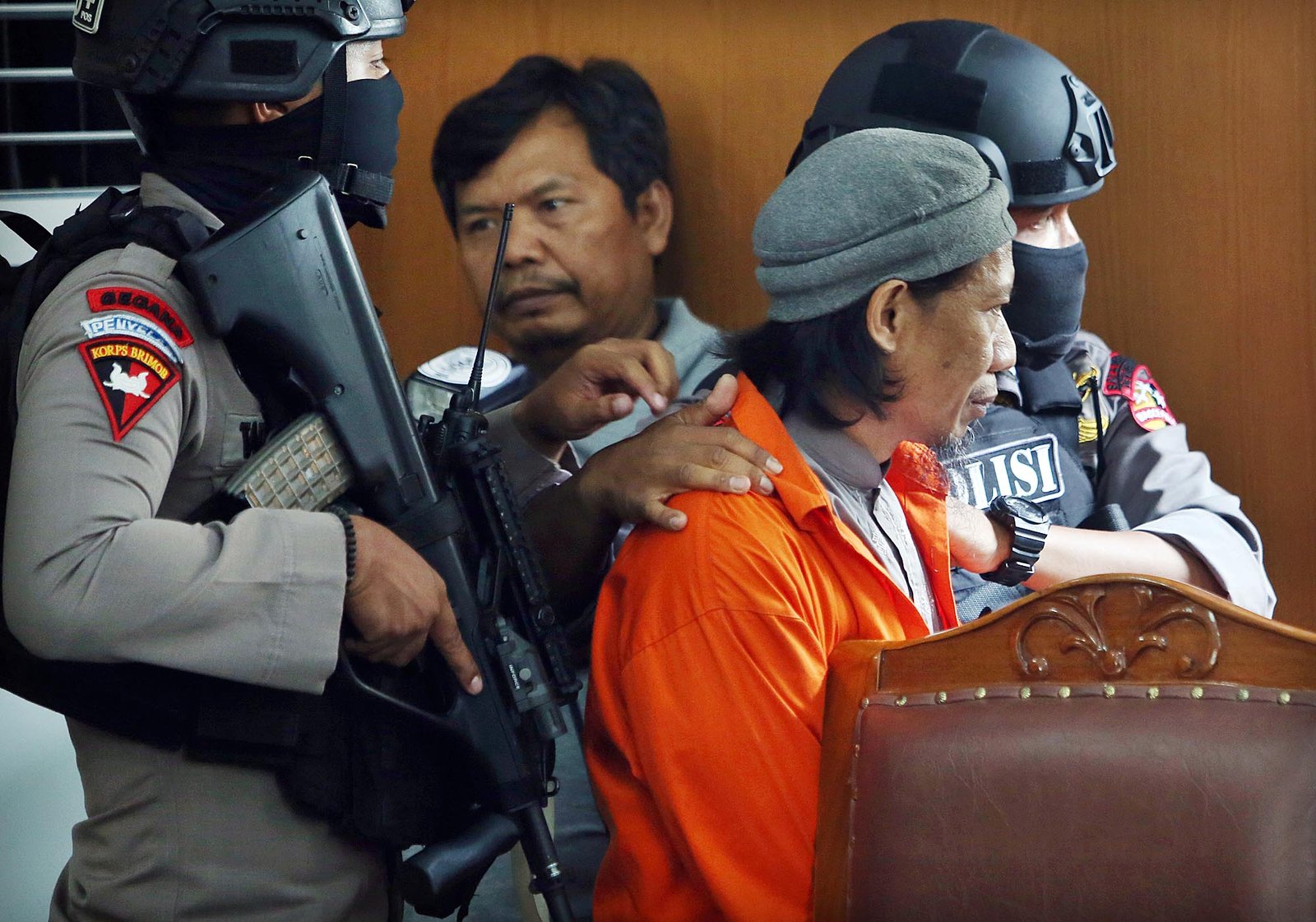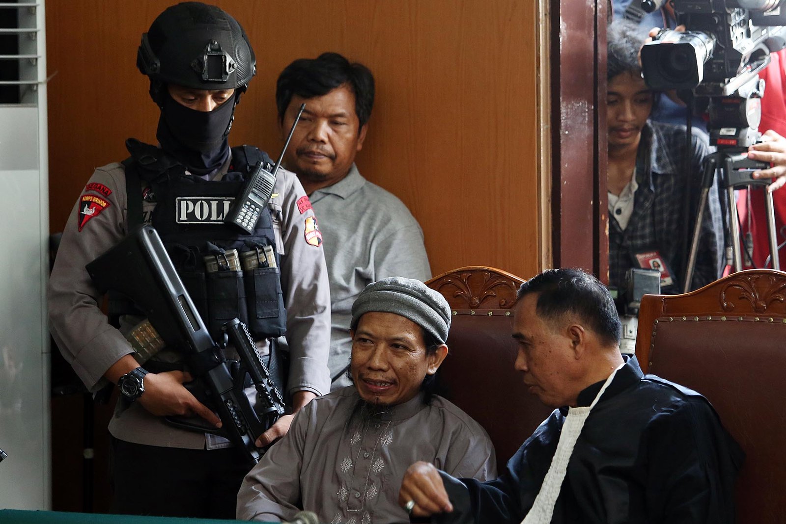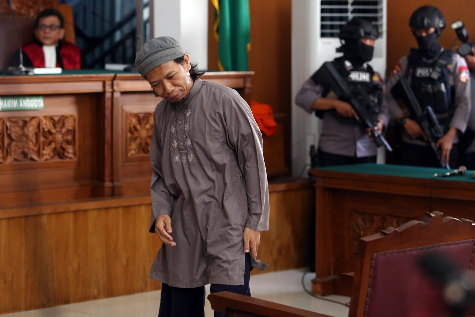 Terdakwa kasus dugaan teror bom Thamrin, Aman Abdurrahman alias Oman Rochman saat menjalani sidang dengan agenda pembacaan tuntutan di PN Jakarta Selatan, Jumat (18/5/18). Aman Abdurrahman dituntut hukuman mati untuk perbuatan terorisme yaitu serangan bom Gereja Oikumene di Samarinda pada 2016, serangan di Jalan MH Thamrin Jakarta pada 2016, dan bom di Terminal Kampung Melayu di Jakarta pada 2017, serta dua penembakan terhadap polisi di Medan dan Bima pada 2017 yang mengakibatkan hilangnya banyak nyawa.(Bisnis Jakarta/ADE)
