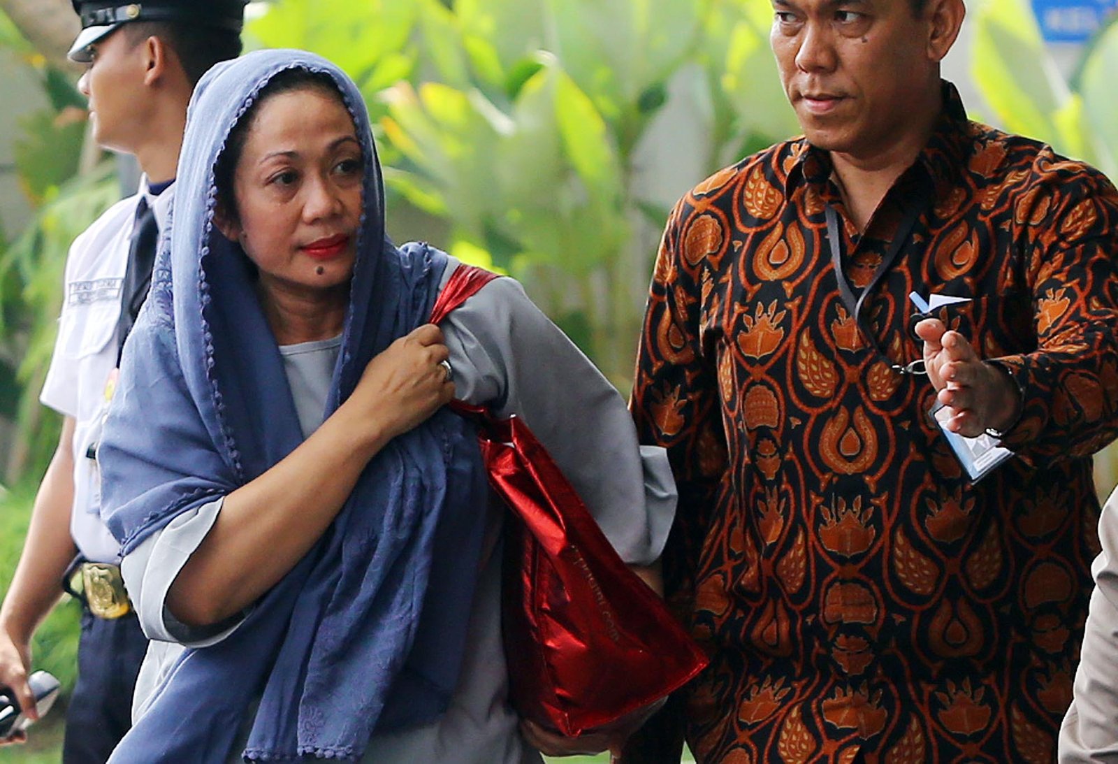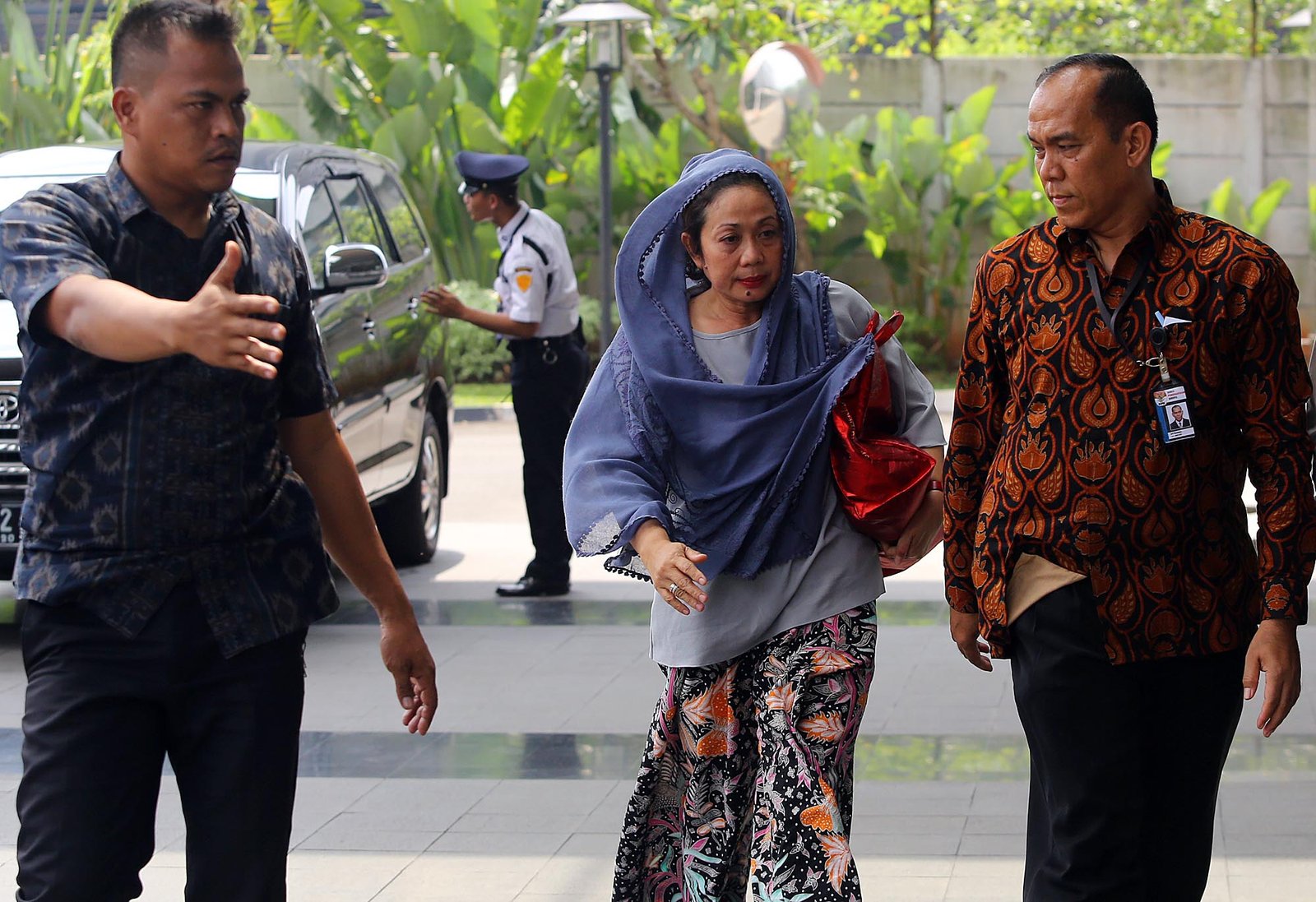 Istri Bupati Bengkulu Selatan Dirwan Mahmud, Heni Dirwan digiring petugas saat tiba untuk menjalani pemeriksaan di gedung Komisi Pemberantasan Korupsi (KPK) di Kuningan, Jakarta Selatan, Rabu (16/5/18). KPK melakukan Operasi Tangkap Tangan (OTT) terhadap Bupati