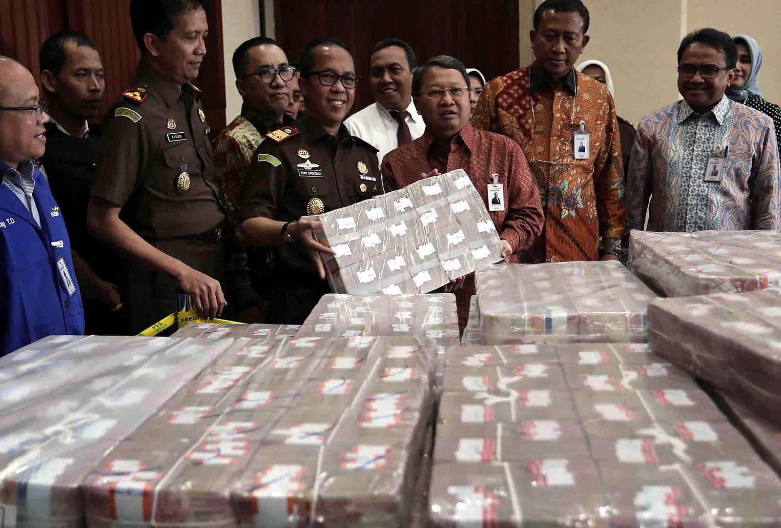Kepala Kejaksaan Tinggi DKI Jakarta Toni Spontana (tengah) menyerahkan secara simbolis kepada Wakil Direktur Utama Bank Mandiri Sulaiman A. Arianto (3kanan) uang ganti rugi korupsi Bantuan Likuiditas Bank Indonesia (BLBI) dari terpidana Samadikun Hartono di Gedung Bank Mandiri, Jakarta, Kamis (17/5/18). Terpidana kasus korupsi BLBI Samadikun Hartono mengembalikan sisa kerugian negara senilai Rp87 miliar. Mantan Komisaris Utama PT Bank Modern itu terbukti korupsi dana talangan BLBI dan dihukum 4 tahun penjara serta berkewajiban untuk mengembalikan uang yang dikorupsinya sebesar Rp 169 miliar secara dicicil.(Bisnis Jakarta/ADE)