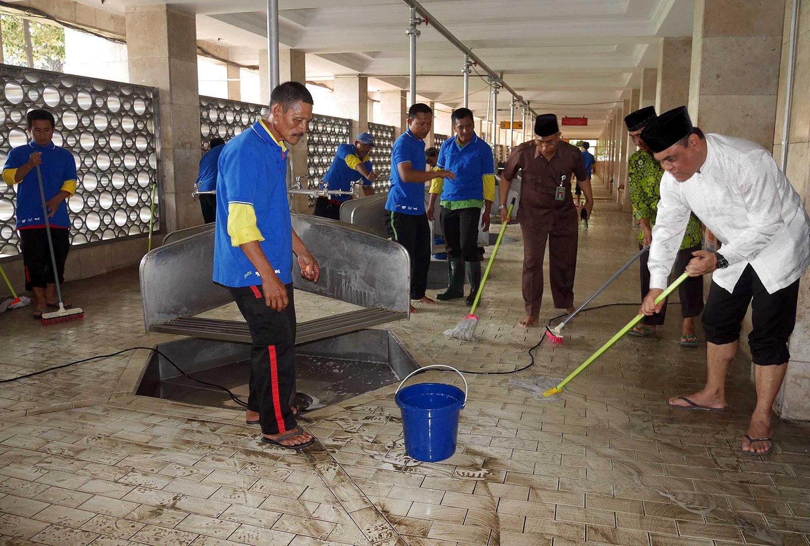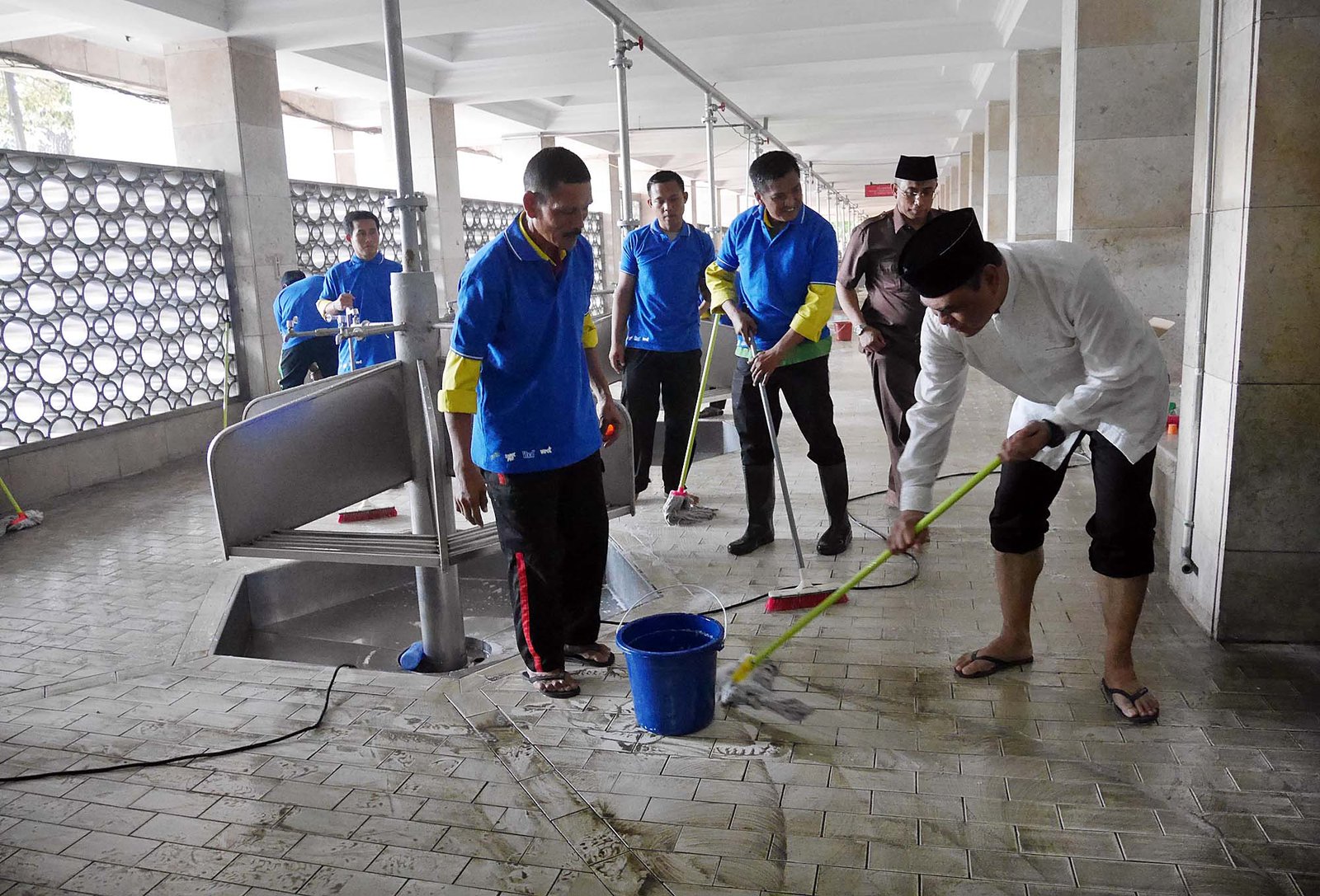 Wakapolri Komjen Pol. Syafruddin yang juga sebagai Wakil Ketua Umum DMI bersama para petugas membersihkan area Masjid Istiqlal, Jakarta Pusat, Selasa (8/5/18). Kegiatan bersih-bersih masjid tersebut dalam rangka menyambut Bulan Suci Ramadhan 1439 H.(Bisnis Jakarta/ADE)