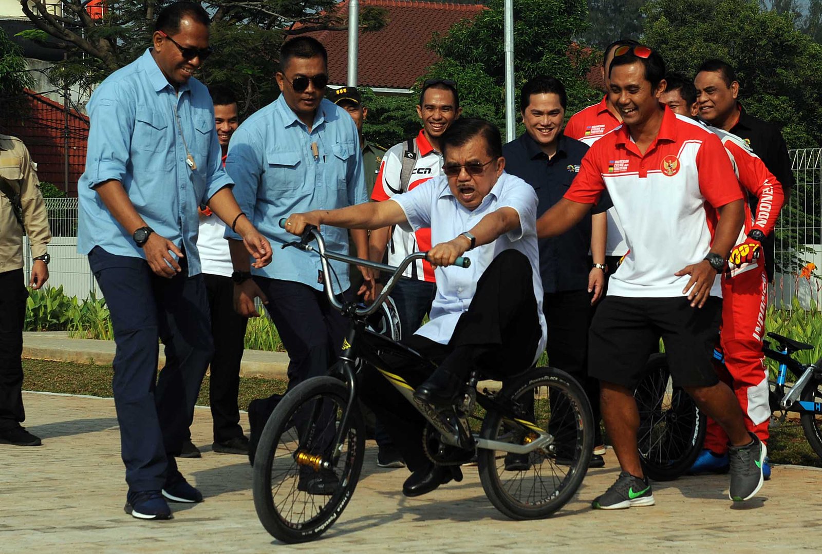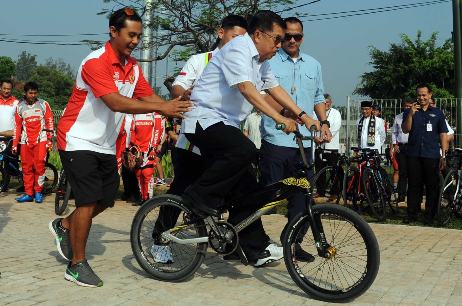 Wapres Jusuf Kalla mencoba sepeda BMX saat meninjau venue BMX di BMX International Center Pulomas, Jakarta Timur, Jumat (29/6/18). Kunjungan wapres kesejumlah venue tersebut untuk melihat kesiapan venue dan pelatnas jelang pelaksanaan Asian Games 2018 pada Agustus mendatang.(Bisnis Jakarta/ADE)