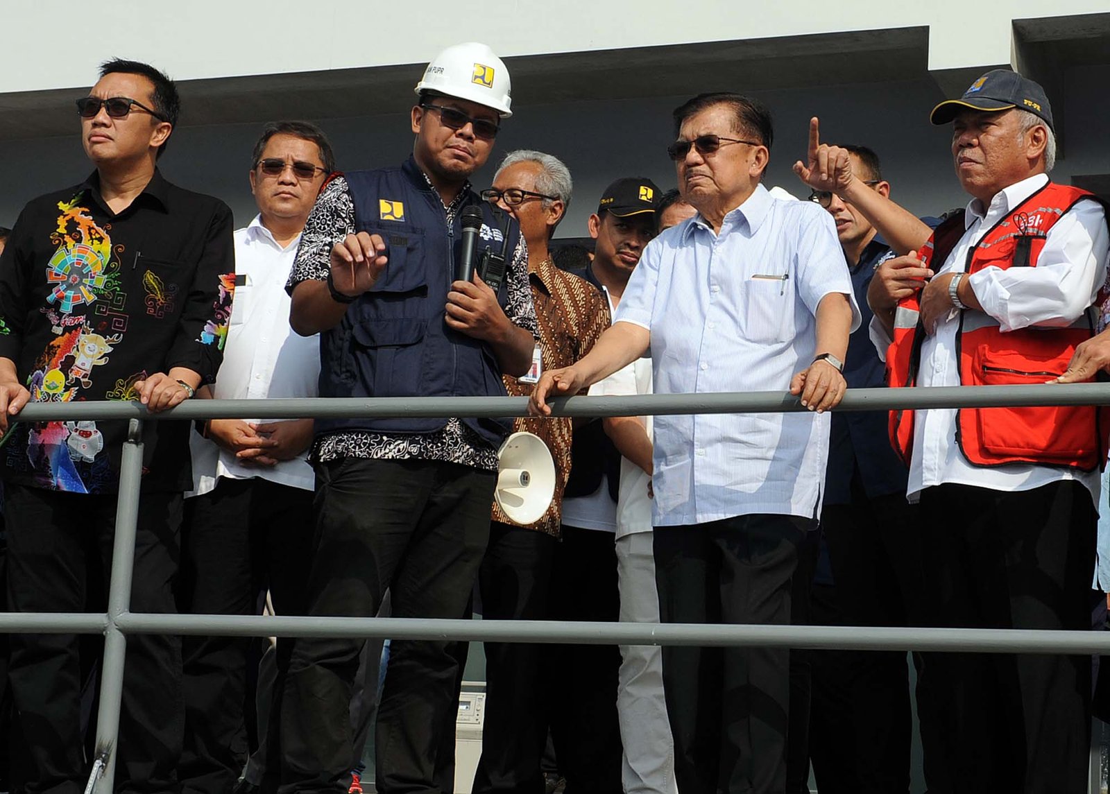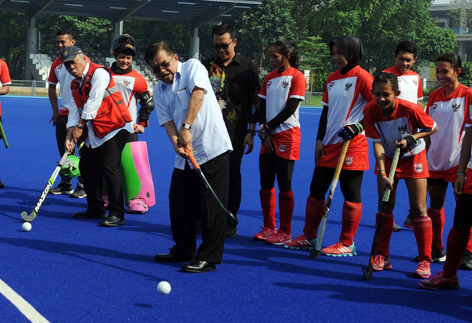 Wapres Jusuf Kalla bersama Menteri PUPR Basuki Hadimuljono (kiri) mencoba memukul bola hoki saat meninjau venue hoki di Kompleks Gelora Bung Karno, Senayan, Jakarta Pusat, Jumat (29/6/18). Kunjungan wapres dan sejumlah menteri kesejumlah venue tersebut untuk melihat kesiapan venue dan pelatnas jelang pelaksanaan Asian Games 2018 pada Agustus mendatang.(Bisnis Jakarta/ADE)