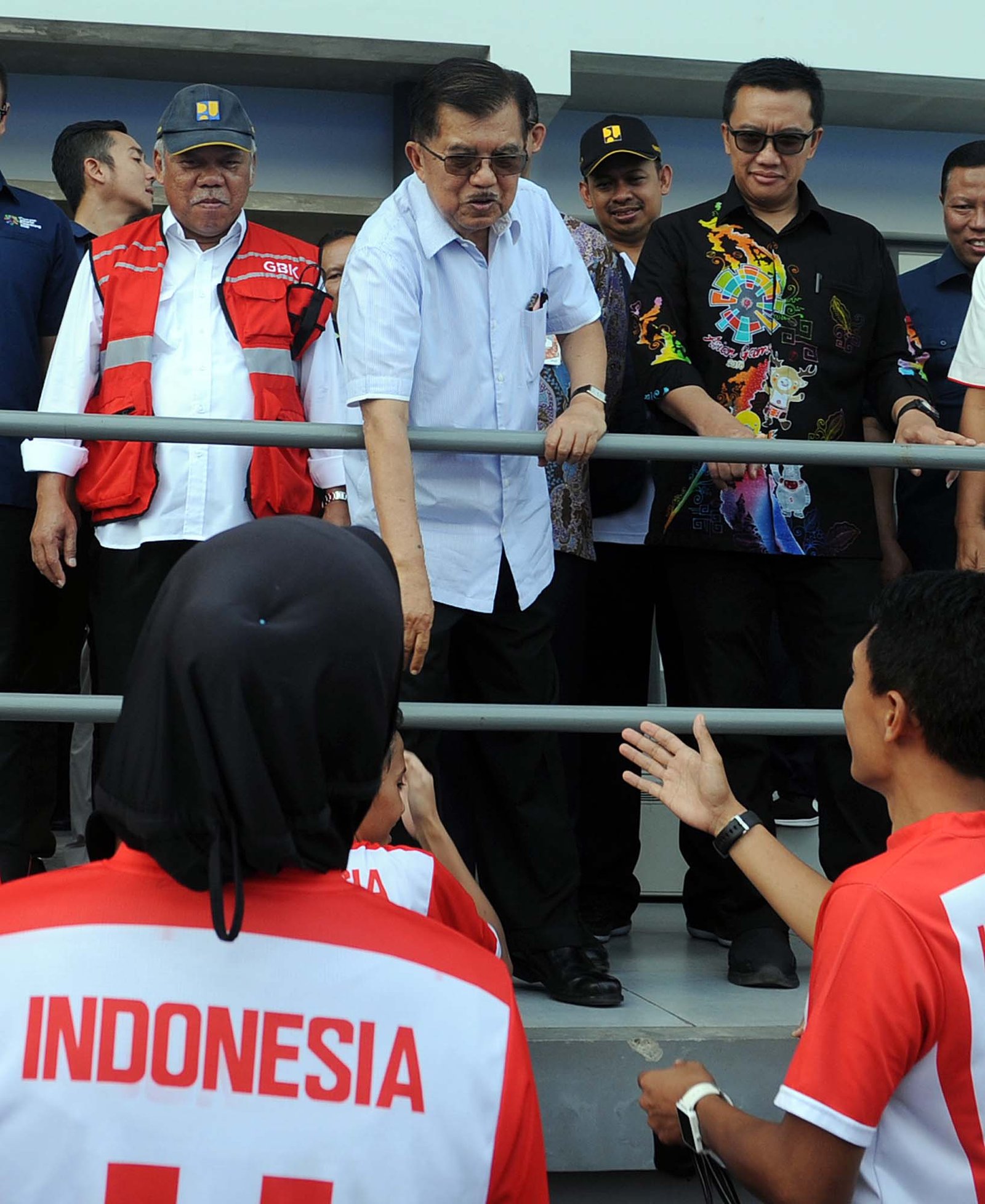 Wapres Jusuf Kalla didampingi Menpora Imam Nahrawi (kanan), Menteri PUPR Basuki Hadimuljono (kiri) menyalami sejumlah pemain hoki saat meninjau venue hoki di Kompleks Gelora Bung Karno, Senayan, Jakarta Pusat, Jumat (29/6/18). Kunjungan wapres dan sejumlah menteri kesejumlah venue tersebut untuk melihat kesiapan venue dan pelatnas jelang pelaksanaan Asian Games 2018 pada Agustus mendatang.(Bisnis Jakarta/ADE)