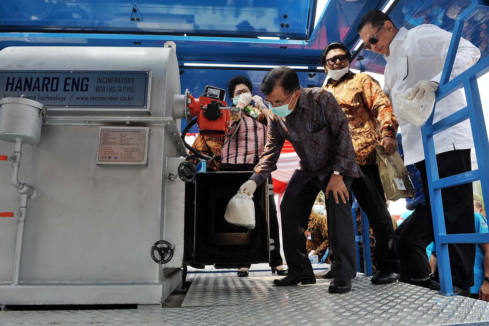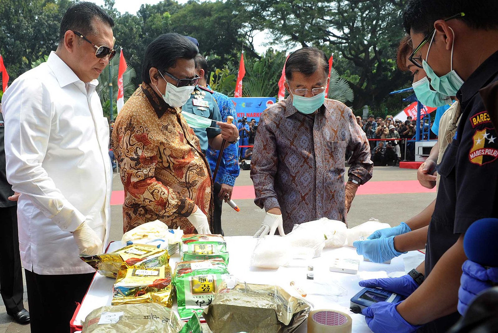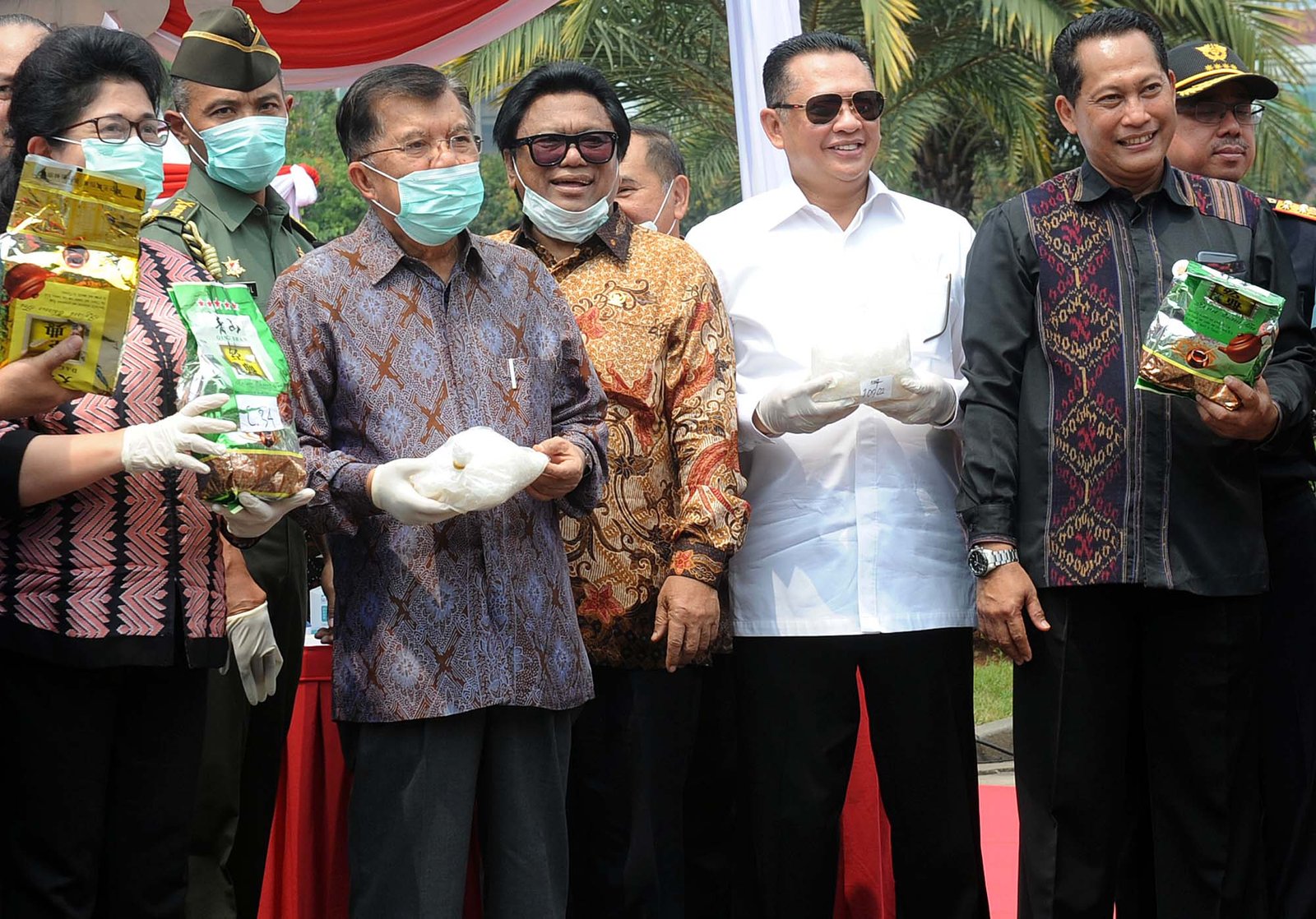 Wapres Jusuf Kalla didampingi Ketua DPR RI Bambang Soesatyo, Ketua DPD RI Oesman Sapta Odang dan sejumlah pejabat lain saat pemusnahan sabu seberat 2,6 ton di Lapangan Silang Monas, Jakarta Pusat, Jumat (4/5/18). Narkotika jenis sabu sebanyak 2,647 ton