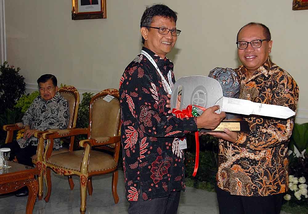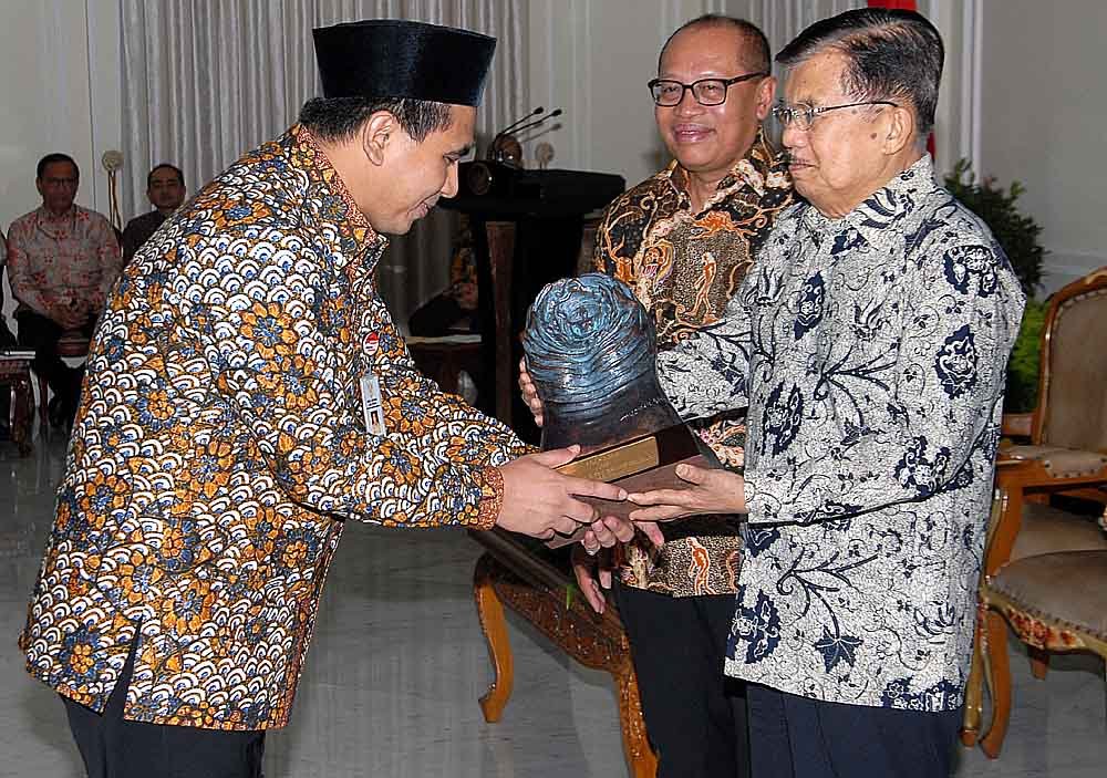 Wapres JK bersama Dirut BPJS Ketenagakerjaan Agus Susanto (tengah) menyerahkan Anugerah Paritrana di Istana Wakil Presiden, Jakarta, Rabu (3/7/2019). Anugerah Paritrana merupakan bentuk apresiasi dari BPJS Ketenagakerjaan bersama Kemenko PMK kepada para pemerintah daerah dan perusahaan yang sepanjang tahun 2018 mendukung penuh implentasi dan tertib administrasi jaminan sosial ketenagakerjaan.