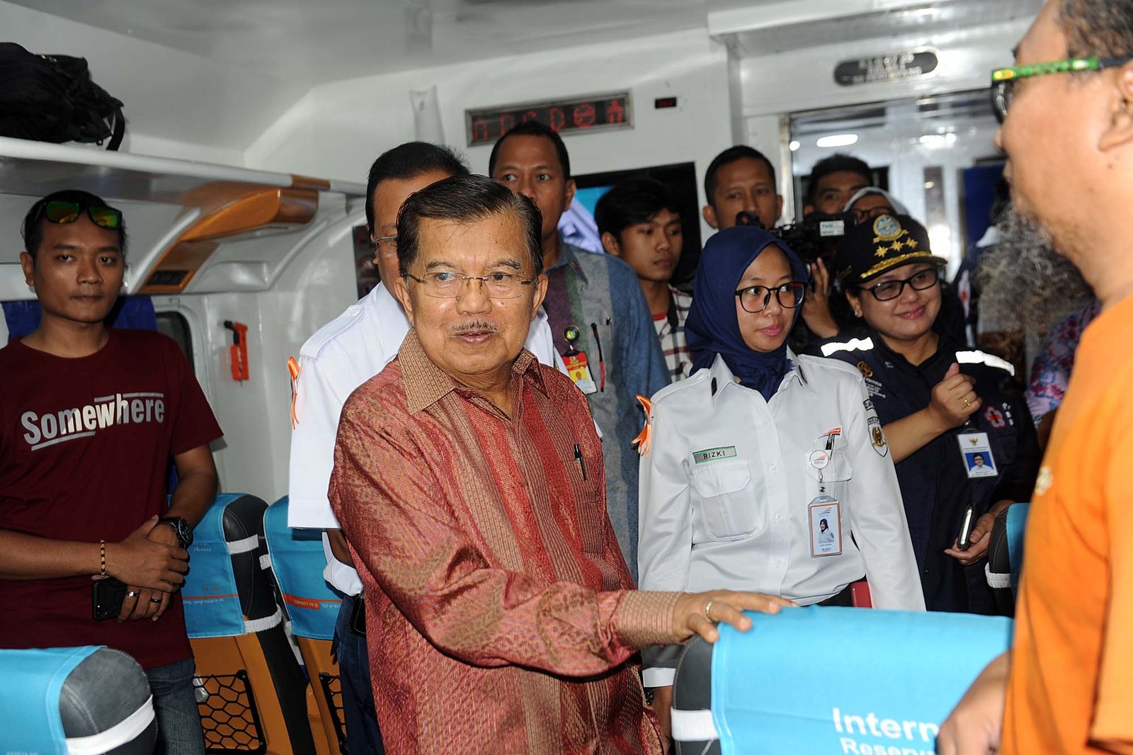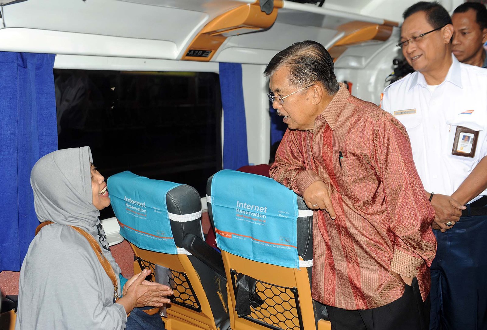 Wapres Jusuf Kalla berbincang dengan pemudik di dalam gerbong KA Argo Dwipangga tujuan Solo Balapan sebelum melepas relawan PMI dan Kementerian Perhubungan dalam menghadapi mudik Lebaran 2018 di Stasiun Gambir, Jakarta Pusat, Kamis (7/6/18).(Bisnis Jakarta/ADE)