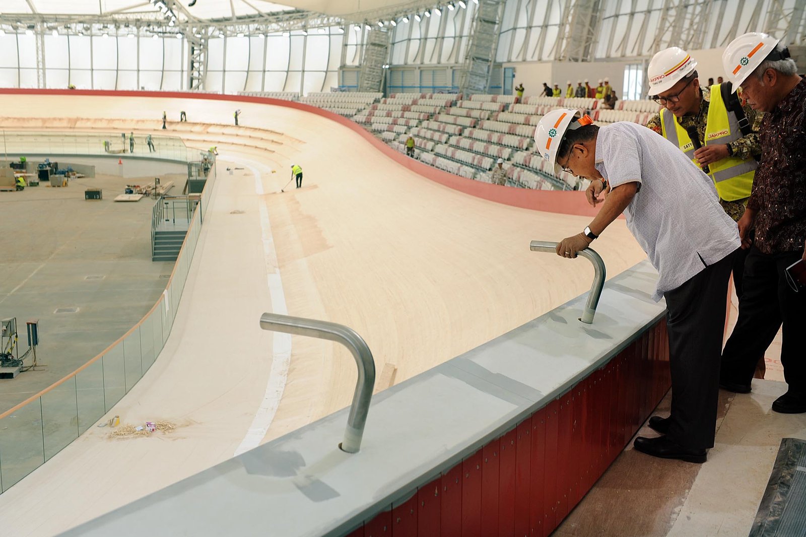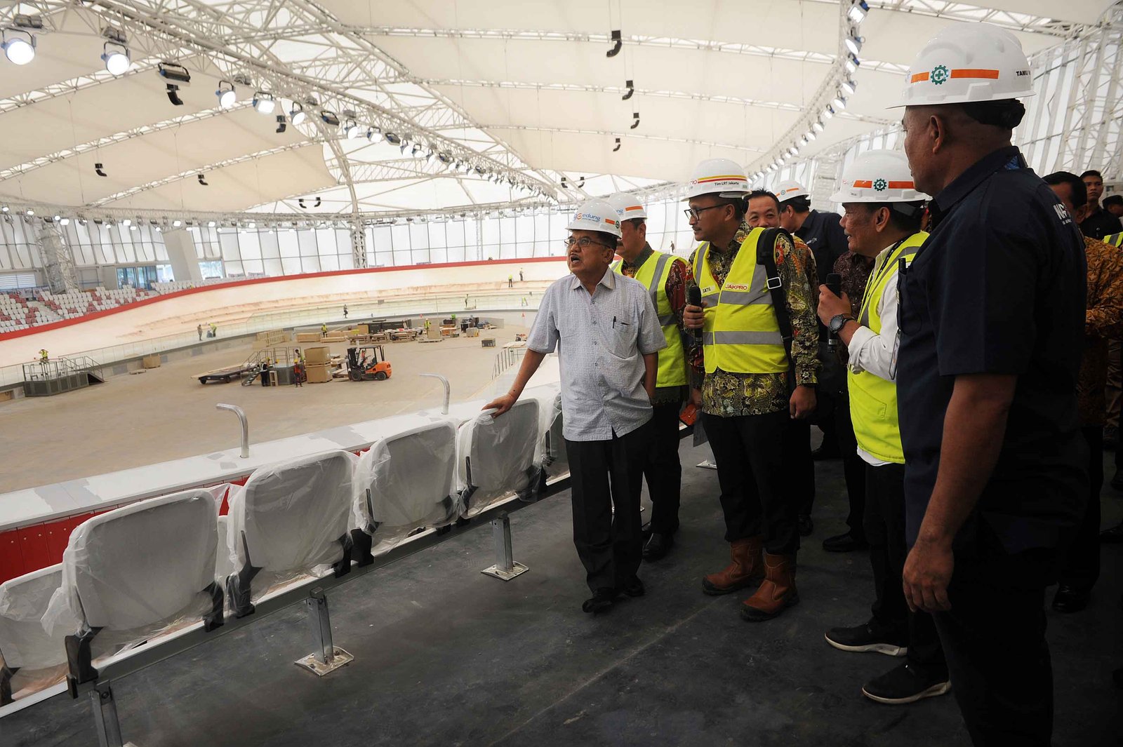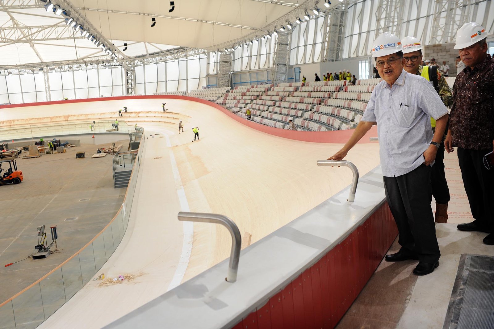 Wapres Jusuf Kalla didampingi Menteri Pekerjaan Umum dan Perumahan Rakyat M Basuki Hadimuljono, Ketua KONI Tono Suratman saat meninjau Velodrome Rawamangun, Jakarta Timur, Jumat (27/4/18) yang akan digunakan untuk balap sepeda Asian Games 2018. Peninjauan tersebut guna melihat kesiapan jelang Asian Games 2018 yang akan berlangsung pada 18 Agustus 2018. (Bisnis Jakarta/ADE)