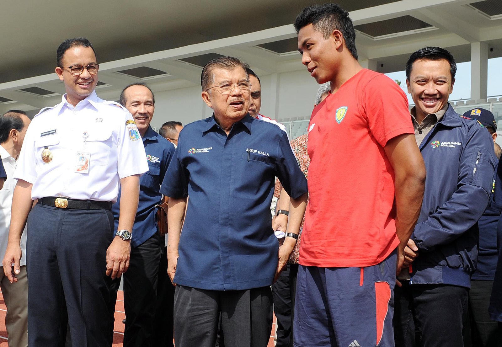 Wapres Jusuf Kalla didampingi Gubernur DKI Jakarta Anies Baswedan, Ketua Umum PB PASI Mohamad Bob Hasan, Menpora Imam Nahrawi, Ketua Inasgoc Erick Thohir dan CdM Asian Games Komjen Pol Syafruddin melihat Pelatnas Atletik saat mengunjungi Stadion Madya di Kompleks Gelora Bung Karno, Jakarta, Jumat (3/8/18). Wapres Jusuf Kalla meninjau Wisma Atlet Kemayoran dan sejumlah arena untuk mengetahui persiapan Asian Games 2018.(Bisnis Jakarta/ADE)