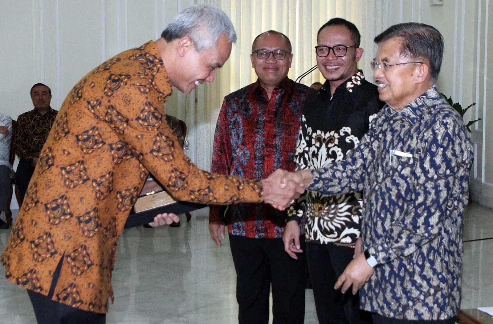Wapres Jusuf Kalla didampingi Menaker Hanif Dhakiri dan Dirut BPJS Ketenagakerjaan Agus Susanto (kiri) memberikan penghargaan Paritrana Award terkait implementasi jaminan sosial ketenagakerjaan kepada Gubernur Jawa Tengah Ganjar Pranowo di Istana Wapres, Jakarta, Selasa (31/7) kemarin. Penghargaan diberikan sebagai bentuk apresiasi kepada pemenang atas kepeduliannya dalam menjalankan amanah Undang-undang dalam pelaksanaan jaminan sosial ketenagakerjaan di wilayah masing-masing. Bentuk apresiasi yang diberikan berupa piala yang dinamakan Paritrana yang berarti perlindungan, yang berasal dari bahasa Sansekerta dan piala ini didesain oleh seniman ternama Indonesia, I Nyoman Nuarta.