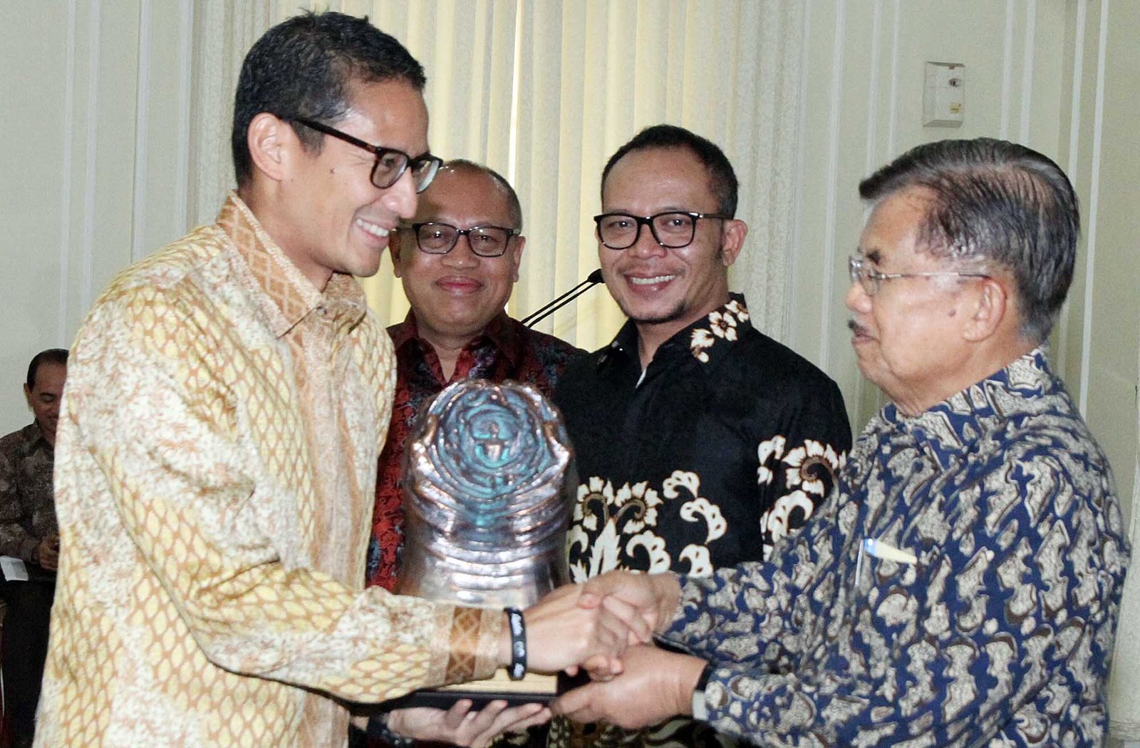 Wapres Jusuf Kalla didampingi Menaker Hanif Dhakiri dan Dirut BPJS Ketenagakerjaan Agus Susanto (kiri) memberikan penghargaan Paritrana Award terkait implementasi jaminan sosial ketenagakerjaan kepada Wagub DKI Sandiaga Uno di Istana Wapres, Jakarta, Selasa (31/7) kemarin. Penghargaan diberikan sebagai bentuk apresiasi kepada pemenang atas kepeduliannya dalam menjalankan amanah Undang-undang dalam pelaksanaan jaminan sosial ketenagakerjaan di wilayah masing-masing. Bentuk apresiasi yang diberikan berupa piala yang dinamakan Paritrana yang berarti perlindungan, yang berasal dari bahasa Sansekerta dan piala ini didesain oleh seniman ternama Indonesia, I Nyoman Nuarta